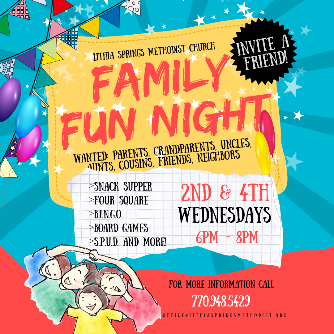 Invite a friend or neighbor and join us for some fun! All ages are welcome! If you have an idea for a game or activity you’d like to share at a future FFN, let the church office know!