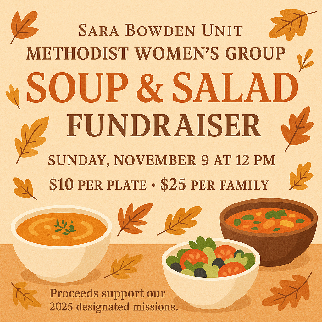 Save the date and plan to join us for the Sara Bowden Unit Methodist Women’s Group Soup & Salad Fundraiser on Sunday, November 9th, at 12pm after worship in the Fellowship Hall. The cost is $10 per person or $25 per family. Let’s show them our support for their 2025 designated missions!
